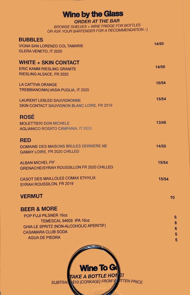 "Bar Part Time" in San Francisco is a trendy wine bar with live DJ music, creating a vibrant atmosphere for patrons. The menu features a variety of wines, including Rosé and Reds, alongside beer and non-alcoholic beverages. Customers praise the intimate ambiance, dance floor with disco ball, and friendly service. The bar offers discounts on bottles before 7pm and hosts events like drag shows and vinyl DJ nights. While the wine portions may be on the smaller side, the quality is top-notch. The mix of retro decor and modern vibes make this spot a favorite for young adults looking for a fun night out. Whether you're a wine connoisseur or just looking to unwind, Bar Part Time is a must-visit for a unique and enjoyable experience.